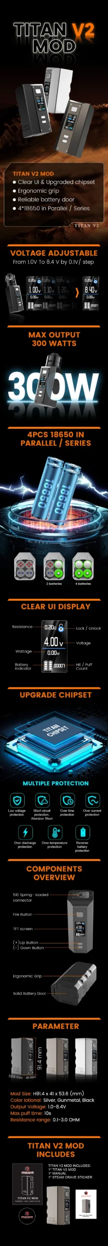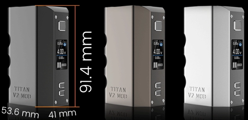 The Titan v2 mod can deliver up to 300 watts of power. It can take up to 41mm diameter atomizers with no over-hang.